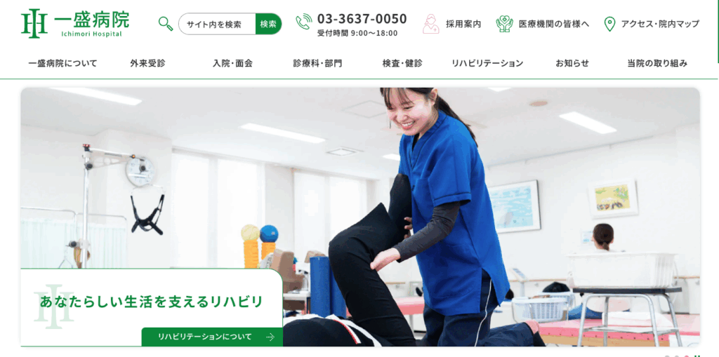 トップページには「外来案内」「入院・面会」「リハビリテーション」「地域連携」など主要情報を整理。初診患者でも目的のページに最短でアクセスできる導線設計がなされています。