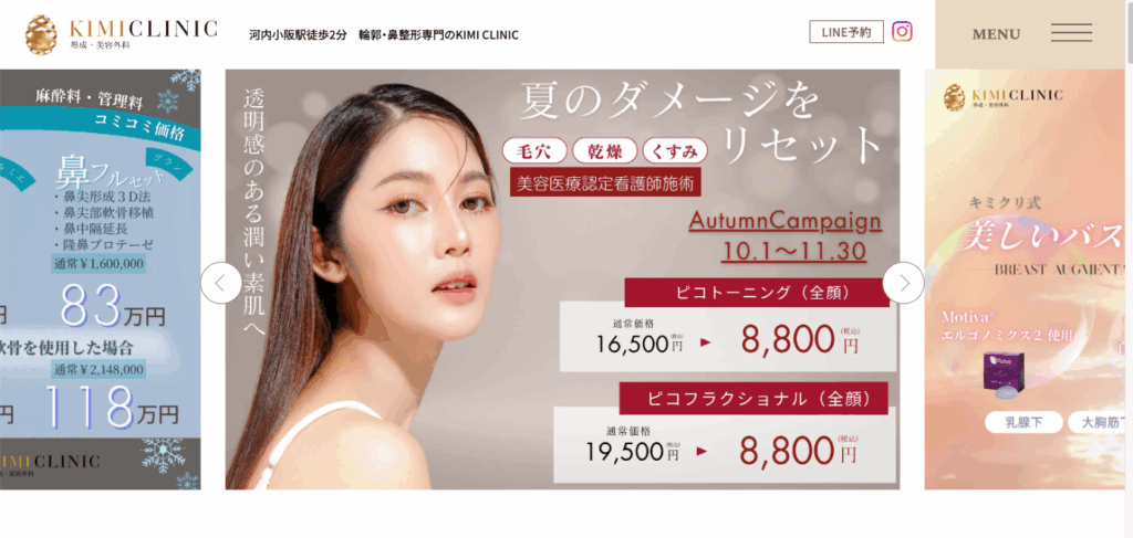 メニューには「施術メニュー」「症例」「ドクター紹介」「料金表」「アクセス」「コンセプト」など、ユーザーが“どの施術か”“どれくらいか”“誰がやるか”を知りたい情報が整理されています。 特に「症例」「料金」「コンセプト」が目立つ位置に配置されており、美容クリニックにおける情報訴求の主要ポイントがカバーされています。