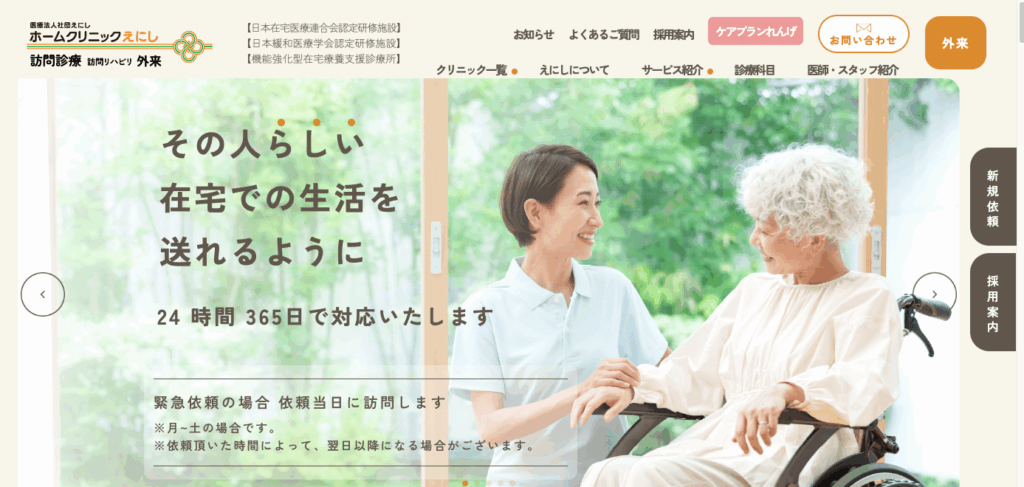 東京都練馬区を拠点に在宅医療・訪問診療を行う「ホームクリニックえにし」は、クリニックというより「患者の自宅を総合病院のように」という理念を持ち、ウェブサイトではその理念を一貫して伝えるデザインになっています。
