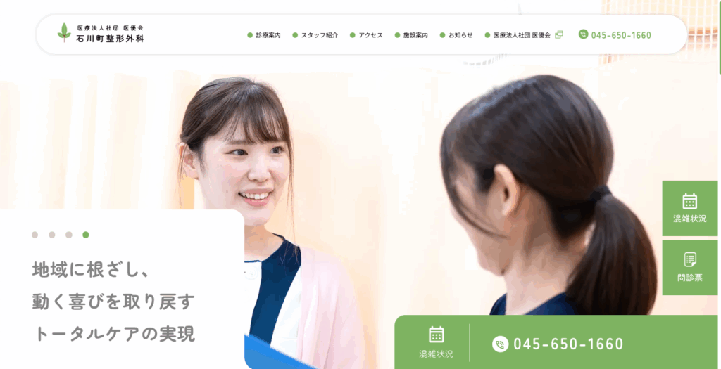 メインメニューに「診療案内」「スタッフ紹介」「施設案内」「アクセス」「混雑状況」といった項目があるため、患者が知りたい「どこで・誰が・何を・どういう時間で」的な疑問にスムーズにアクセスできます。特に「混雑状況」のリンクがある点は、整形分野で「待ち時間を避けたい/スムーズに受けたい」ユーザーにとって価値が高く、ユーザビリティの観点でも優れていると言えます。