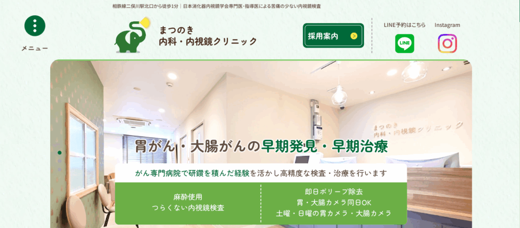 トップページでは「胃がん・大腸がんの早期発見・早期治療」というキャッチが大きく表示されており、緑系をアクセントにした配色が用いられています。 写真も検査機器や内視鏡検査の様子、院内のスッキリとした環境などがあり、「高度な検査を行える」クリニックという印象を与えます。空間も明るく白+ベージュ系を基調に、清潔でモダンな印象。