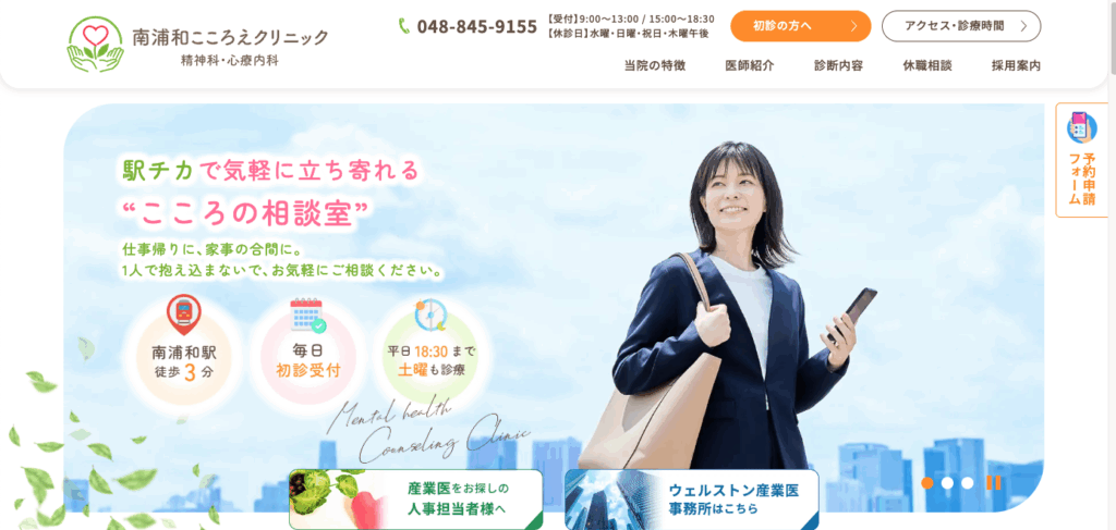 トップビューには「駅チカで気軽に立ち寄れる“こころの相談室”」というキャッチコピーがあり、写真素材として南浦和駅徒歩3分のアクセス、診療時間表示、院内・スタッフの写真などが使われています。 配色は白基調+淡いブルー系で、落ち着きを与える雰囲気。フォントも柔らかめで、硬すぎない印象を受けます。