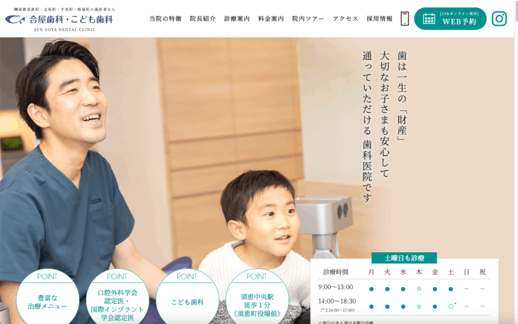 メインのグローバルナビが「当院の特徴」「院長紹介」「診療案内…」と多岐にわたりながらも、トップページで各カテゴリのリンクが整理されているため、ユーザーが「何を診てもらえるのか」「誰がいるのか」「どこにあるのか」を短時間で把握できます。 また、診療時間や予約案内が視覚的にわかるようにアイコン+数字で表示されており、来院検討者にとって利便性が高いです。
