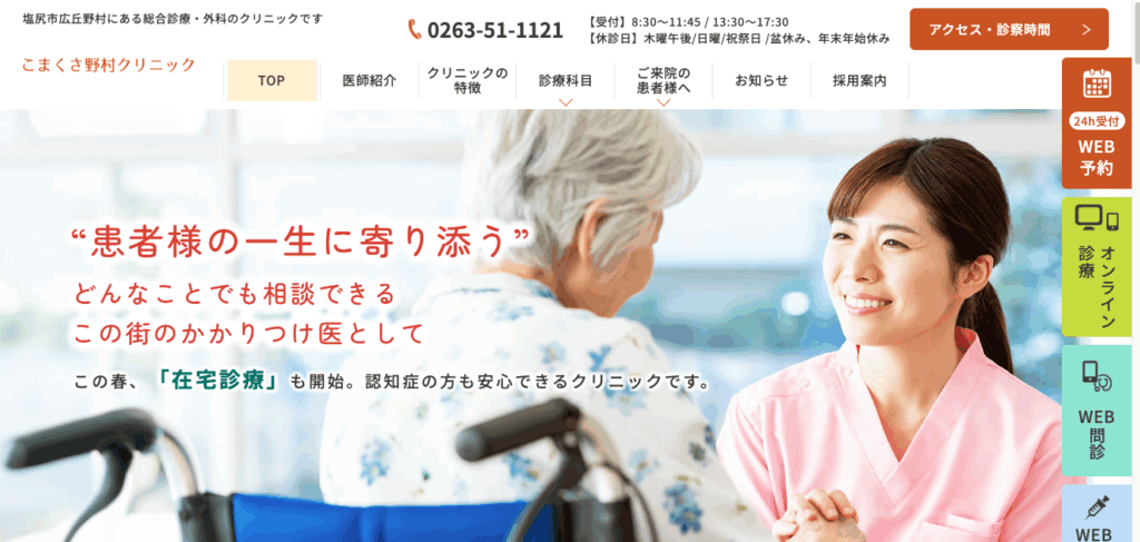 サイト冒頭には「患者様の一生に寄り添う」というメッセージが大きく配置されており、写真素材も「医師と患者・在宅診療・検査機器・クリニック入口」など多岐にわたります。 色使いは白基調+ダークブルーアクセントで、やや落ち着いた印象。地域密着型クリニックらしい“親しみ”と“安心”を両立させています。