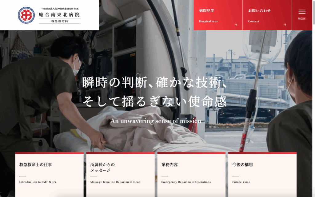 ナビゲーションメニューも「救急救命士の仕事」「所属長からのメッセージ」「業務内容」「今後の構想」という構成で、専門職としての仕事内容を丁寧に説明する設計になっています。閲覧者が「何を知りたいか」「どこから読むか」を迷わずにたどれる構造です。