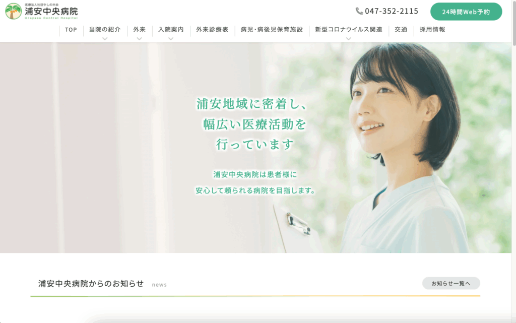 安中央病院のホームページは、「地域の中核病院」としての信頼感と、「患者一人ひとりに寄り添うあたたかさ」を両立させたデザインが特徴です。トップページのファーストビューには、やわらかな光が差し込む院内写真とともに「地域とともに歩む医療を」という理念が配置され、見る人に安心感と誠実さを伝えています。白を基調としたクリーンな背景に、アクセントカラーとして穏やかなブルーやベージュを使用しており、病院サイトにありがちな堅さを感じさせません。