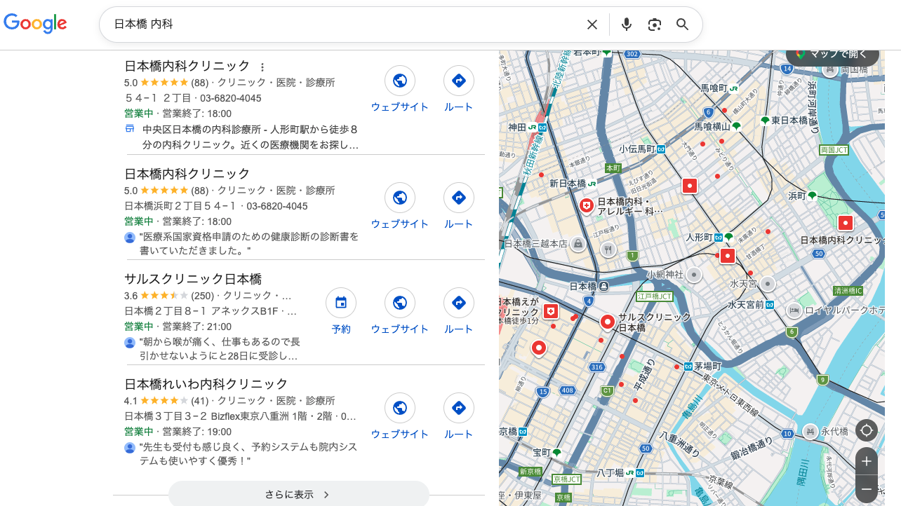 「近くの内科」「〇〇駅 皮膚科」といった検索をすると、検索結果の上部に地図と一緒にクリニックが表示されます。このエリアはローカルパック(地図と一緒に表示される店舗一覧)と呼ばれ、ここに表示されることで電話やルート検索につながりやすくなります。