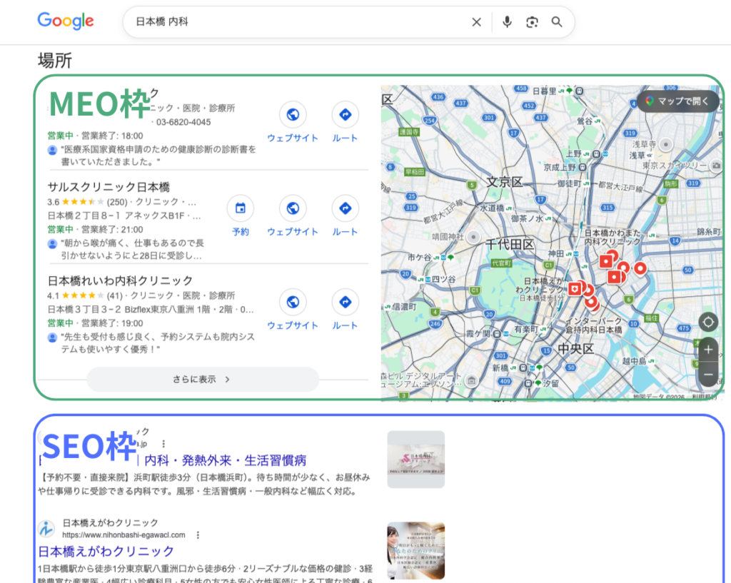SEOは症状や治療法を調べる「情報収集段階」のユーザーに向いていますが、MEOは「今すぐ行ける医療機関を探しているユーザー」に強い施策です。