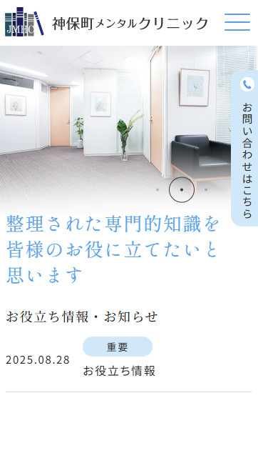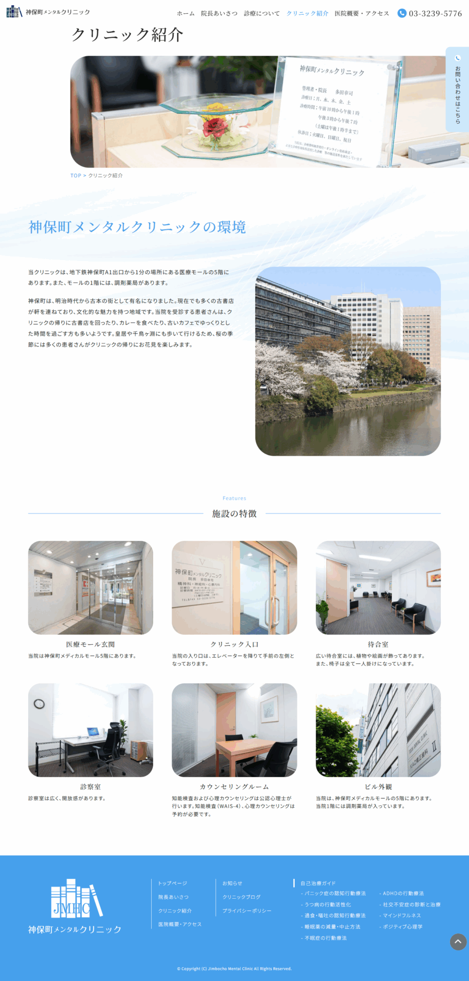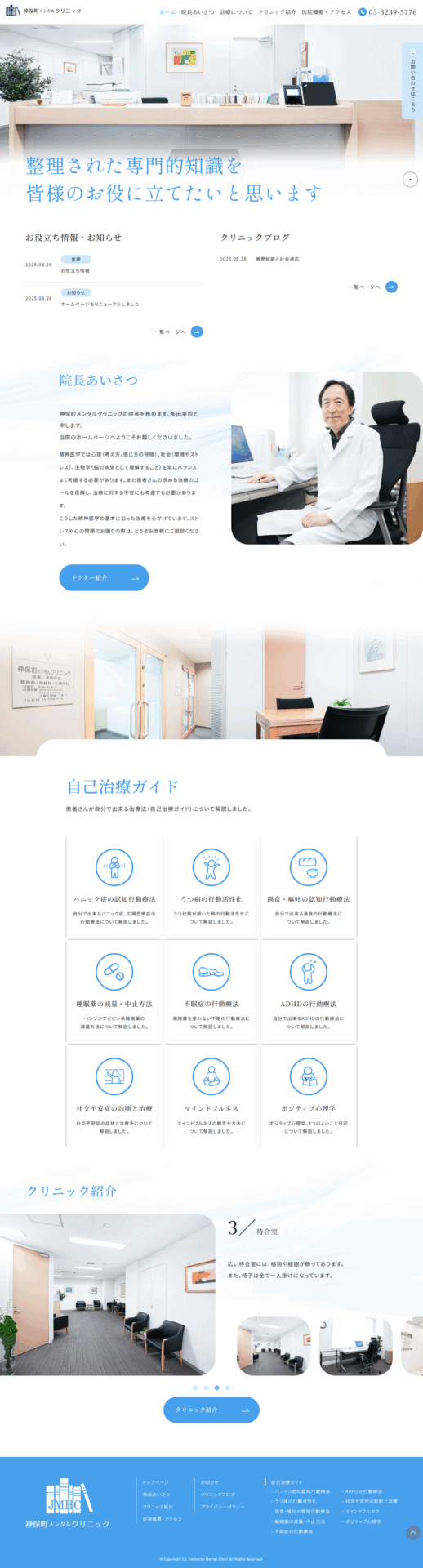 - 本ウェブサイトでは、精神科・心療内科を探している一般患者さま向けに、院長からのメッセージや院内の様子、そして「自己治療ガイド」といった専門的な情報を提供しています。 特に、パニック症やうつ病、不眠症など、特定の症状に悩む方々がご自身で取り組める具体的な治療法を詳細に解説することで、誰もが分かりやすくアクセスできるコンテンツを追求しています。 デザイン面では、広い待合室や開放感のある診察室の写真を通じて、来院される方々に安心感を与えることを重視しています。 これにより、初めて来院される患者さまにも、精神疾患についての情報を探している方にも、それぞれにとって有益で利用しやすい情報サイトを実現しました。